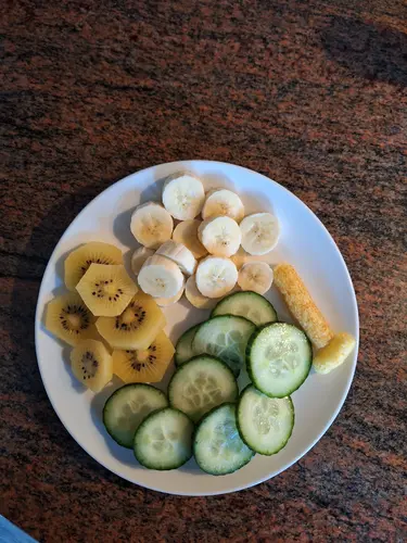 Maar van dit bordje heb ik de meeste komkommer op en de soepstengels en cornflakes waren ook maar voor de helft gegeten.