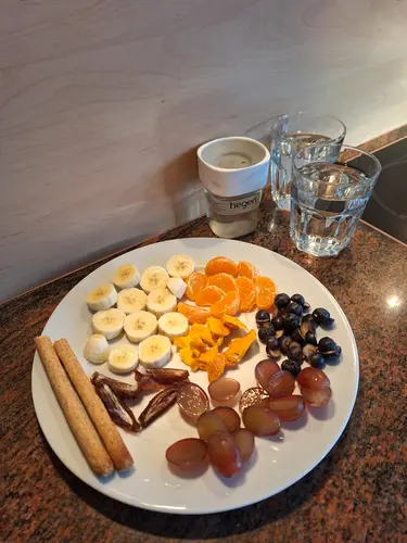 Fruitbordje voor vanmorgen, met gedroogde mango, dadel en soepstengels erbij