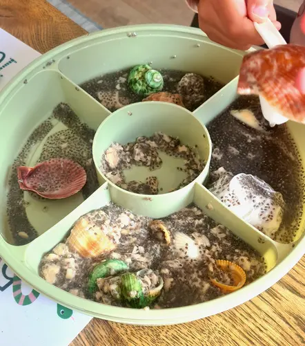 Ik heb twee verschillende bakken. Een kliederbak, waar inderdaad alles door elkaar mag. Voorbeeld foto, met water, chiazaad, gemalen cracker. Gewoon een goedkope bak met deksel. Na 2 dagen spelen, gaat de inhoud weg (behalve de schelpen).