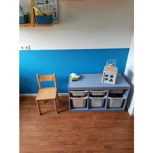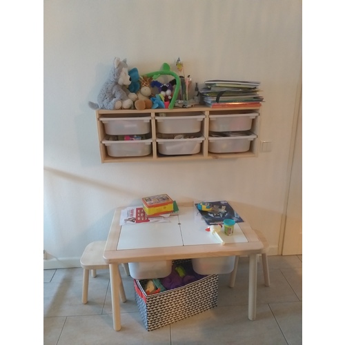 Ik ben er erg blij mee in ieder geval! Ik heb zo'n trofasf kast van de ikea dus ik kan ook altijd nog de desbetreffende bak in de woonkamer zetten en dan als hij er mee uitgespeeld is ruim ik het weer op in zijn kamer.