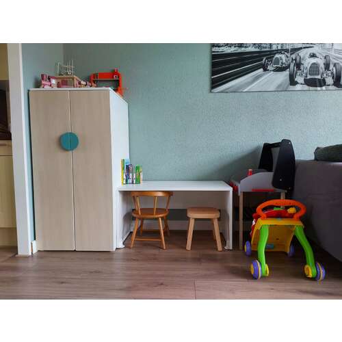 De Smastad-lade met bureautje gecombineerd met het huisje en plankjes waar ik mooi kleine bakjes op kan zetten.