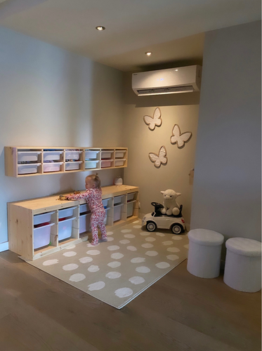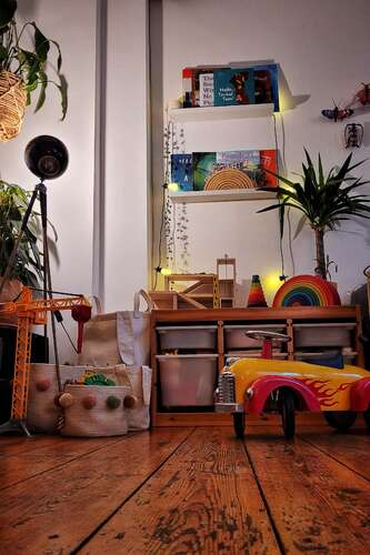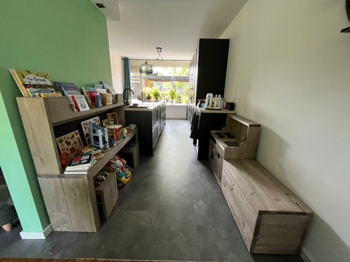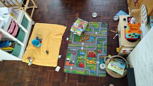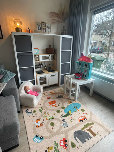 Ik heb geaccepteerd dat mijn halve huiskamer inmiddels speelgoed is 😁 Ik heb niet echt plek voor een aparte hoek, dus het is maar even zo. Voor je het weet zijn ze groter en spelen ze liever op hun kamer. Er staan wat bakken en wat in een kast kan, zit in een kast. En verder probeer ik me gewoon niet te ergeren.