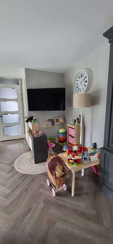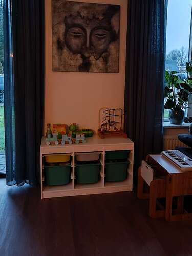 Hier een niet zo grote woonkamer. We hebben een kast met drie planken, waarvan we de onderste plank als speelgoedplank gebruiken. Daar staan twee mandjes met speelgoed en paar boekjes en puzzels. Daarnaast altijd de stapelstein (wordt namelijk dagelijks mee gespeeld) en de rest rouleren we. Oudste heeft z’n speelgoed ook deels op z’n kamer, vooral Lego en daar speelt hij ook veel.