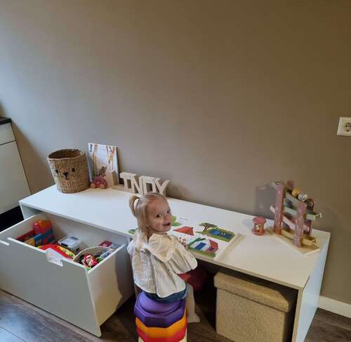 Wij hebben een hoekje met een bureaytje waar wat uitgestald staat. Er staat ook een speelgoedkist onder.