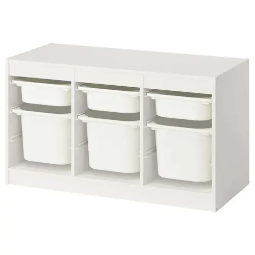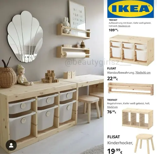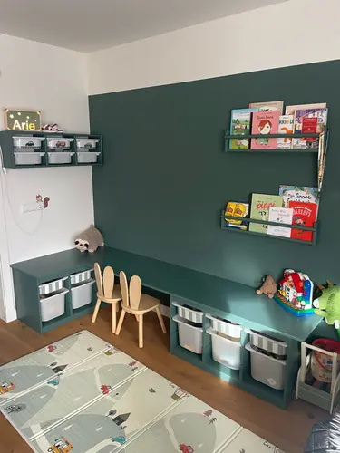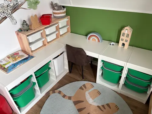 Ik ben vast niet de eerste die dit heeft bedacht, ik zoek forummers die thuis een Trofast kast hebben voor speelgoed (Ikea, zie hieronder), en die daar direct aan vast een speeltafeltje hebben die precies mooi aansluit. Er moeten in ieder geval twee stoeltjes onder passen.