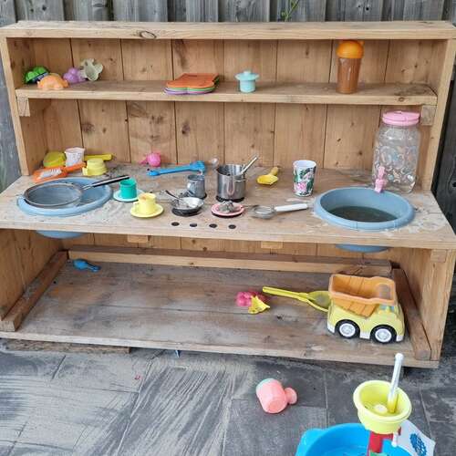 Hier is ze helemaal dol op haar buitenkeuken / modderkeuken. Ik heb hem zelf gemaakt. Je kan hem zo groot maken als je wil... met heel veel opbergruimte. Deze is 160 breed geloof ik en 60 diep. Heerlijk! Ze speelt er uren mee... verder is haar smoby huisje met deur en klapraampjes favoriet en haar picknicktafel. Ze is heelijk in de weer... eten koken voor haar popjes... popje in huisje slapen, raampje open, post pakken, met de poppen aan tafel eten.. heerlijk! Kan mama ff rustig koken. En ook heel sociaal... gaat ze taartjes maken voor je 🥰