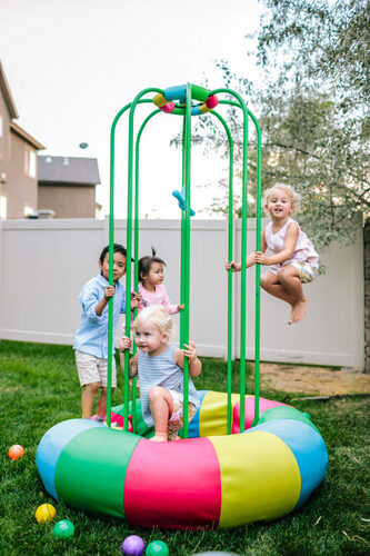 De band staat vast in het frame met de spijlen. Er is geen limiet qua leeftijd, er zouden zelfs volwassenen op kunnen springen tegelijk met kinderen.