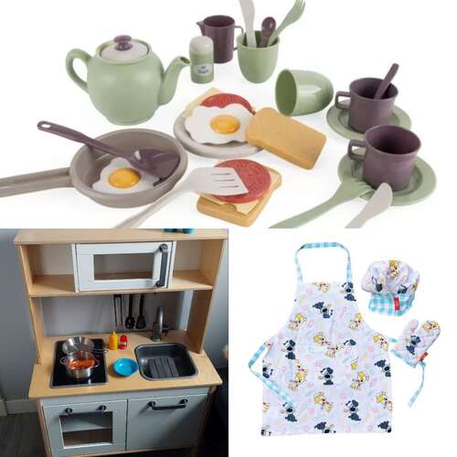 Houten fruit dat je in stukjes kunt snijden (met klitteband er tussen) is nog een leuke aanvulling. Je hebt bijvoorbeeld ook nog houten taartjes die je kunt snijden en kaarsjes in kunt steken, of een pizza.