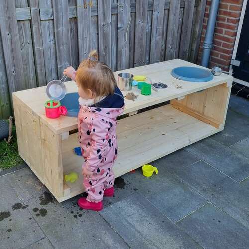 Hier ook een modderkeuken. Dikke hit. Potten, pannen, lepels, flesjes, bakjes. Zand, water, blaadjes, takjes, schelpjes. Uren speelplezier.