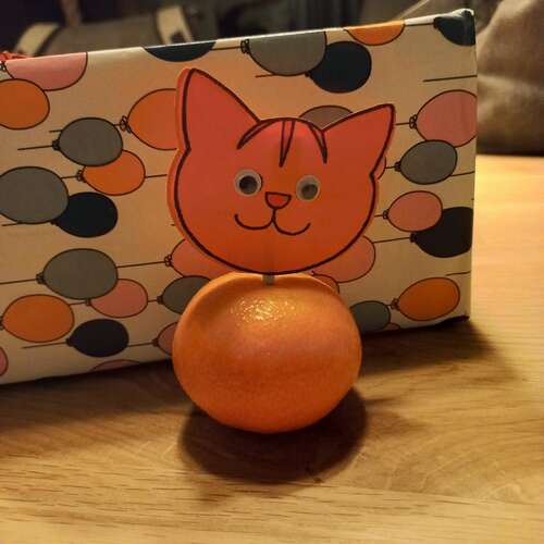 Sjabloon van internet (zoek dikkie dik mandarijntjes) . Uitgeprint op oranje papier. Plak oogjes van de action. Cocktailprikker, dubbel hoofdje erop plakken en klaar.