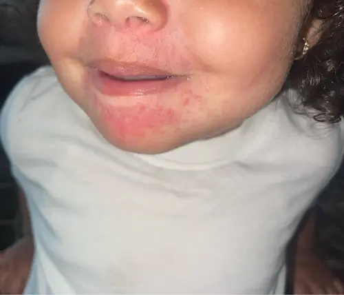 lijkt inderdaad wel op een reactie van iets. Kan heel goed van fruit komen zoals aardei, kiwi en ken ook kinderen die krijgen uitslag rond de mond van mayonaise..