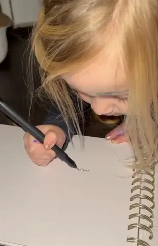 Dit is mijn dochter, ze houd sinds deze week haar potloden zo vast. Maar de juiste pengreep is nog iets verder naar onder en dan haar duim onder haar ring en middelvinger dan hè als ik het goed heb