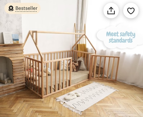 Onze dochter valt sinds kort alleen nog in slaap met mij naast haar. Overleggen in een ledikant gaat niet meer (ze is nu 11 maanden). Ik heb haar nu ‘gewoon’ op een matras gelegd maar dit voelt toch niet helemaal veilig. Ik heb daarom een vloerbed besteld via Etsy die ook nog lang meekan als ze peuter / kleuter is.