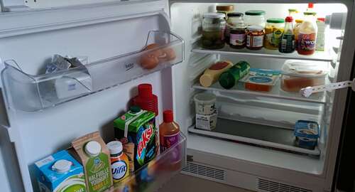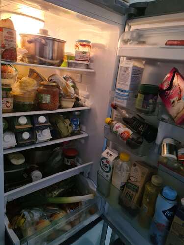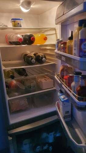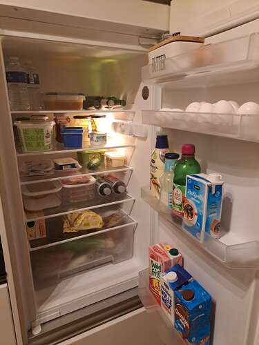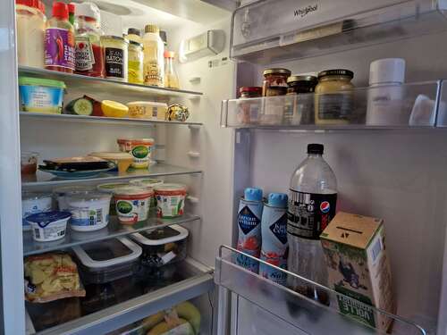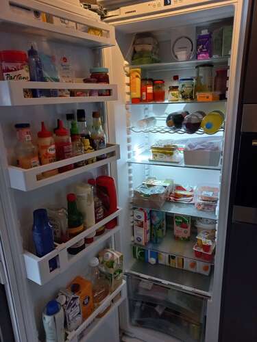 Onze koelkast is redelijk leeg. De onderste lade is voor bezoek, frisdrank en biertjes etc. Wat broodbeleg als kaas, zuivelspread en smeerworst. Veel eieren, sausjes, boter etc. We drinken eigenlijk alleen water, spa en thee. Oja en een wijntje natuurlijk. Maar we hebben ook nog zo'n grote vriezer en die puilt uit. 😂🙈