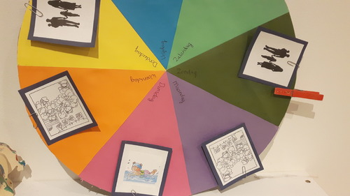 Ik heb zelf een cirkel gemaakt met 7 gekleurde punten. Bewust rond zodat het doorloopt. En plaatjes van psz, gastouder, peuterzwemmen. Een vrolijke knijper om de dag aan te geven. Die verplaatsen we dan sochtends.