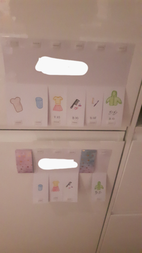 Wij hadden thuis een white board met pictogrammen (plaatjes + foto’s uitgeprint , geplastificeerd + magneet)