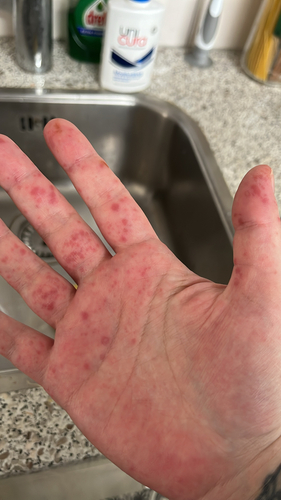 Dit heb ik ook twee keer gehad (ja als volwassenen). Komt weinig voor. Maar bij mij zaten op mn handpalmen en voetzolen allemaal van die rode bultjes/blaartjes. Het voelde alsof het in de brand stond. Was niet prettig. Gelukkig gaat die gevoeligheid wel snel weg, met een paar dagen had ik geen last meer. Hopelijk voor jouw kleintje ook!