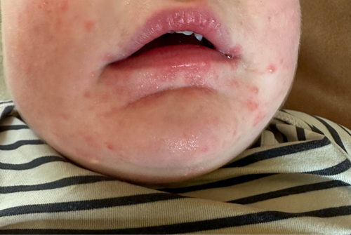 Lijkt op krentenbaard. Dat is behoorlijk besmettelijk. Vooral morgen even de huisarts laten beoordelen want dat moet dan behandeld worden met een bepaald type zalf ( kom even niet op de naam)