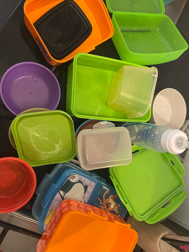 Wij hebben een vakjes trommel, dan kan brood, fruit, groente in één trommel, misschien scheelt dat al weer? En we hebben een soort afdruiprek, dus als de vaatwasser klaar is leggen we het daarop en is het de volgende ochtend droog.