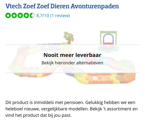 Maar gek dat via de officiële site van Vtech er helemaal geen “baan” en diertjes op wielen op staan. Dan zou je zeggen dat het eruit is? #zonde!