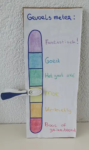 Voor hem had ik een gevoels-meter gemaakt met knijper. Zo kon hij aangeven hoe hij zich voelde zonder het te hoeven vertellen.