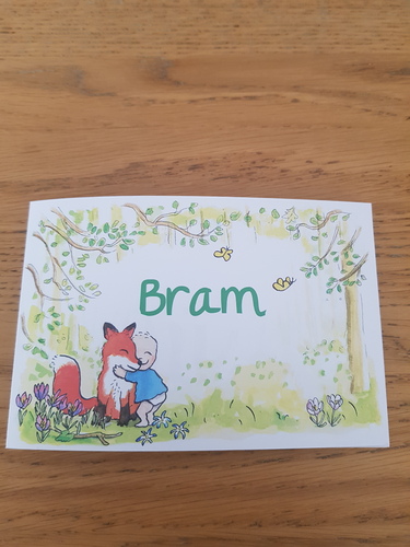 Dit is de voorkant van ons kaartje. Bij Thijs had het vosje een dubbele betekenis. Hoorden later van veel mensen dat ze het zo'n mooi en toepasselijk kaartje vonden.