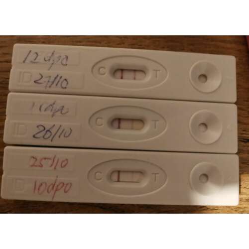 Vandaag mijn NOD, de testen blijven oplopen. Gelukkig. Bij mijn vorige zwangerschap waren ze op deze dag (12dpo) nog heel vaag en nu vind ik de bovenste al behoorlijk duidelijk. Wat een opluchting!