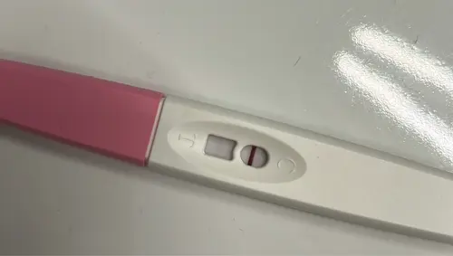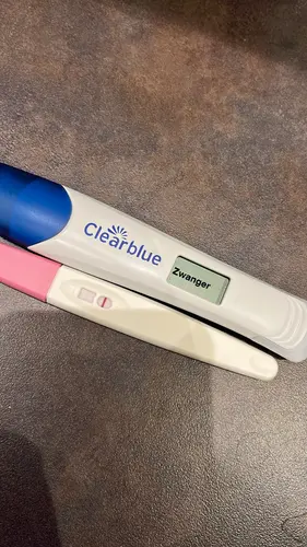 Ik had vanochtend meteen na het opstaan deze test. Er lijkt een licht streepje zichtbaar. Echter, toen ik 3 uur later testte met een early van Clear Blue gaf die aan ‘niet zwanger’. Blijft nog even spannend dus..