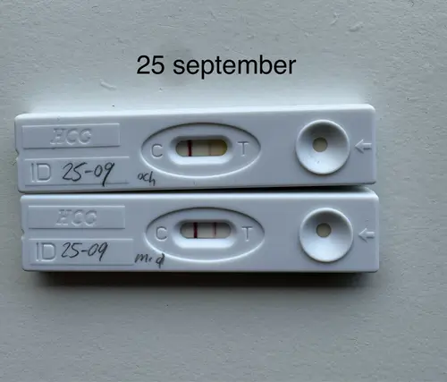 Heel eerlijk? Ik vind de test van 25/9 donkerder dan die van vandaag (26/9), ik hoop dat het goed is maar zou toch eens bloed laten prikken voor de zekerheid