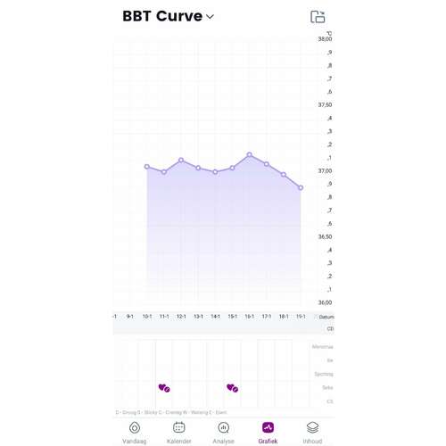 Vlak voor de ovulatie kreeg ik altijd een ovulatiedip waardoor ik op 36,2 kwam te zitten. Hierdoor wist ik dat ik het gezellig kon maken. Wanneer ik 36,9 of 37 had aangetikt wist ik dat de ovulatie was geweest en ik in de lutheale fase zat, toen bleef de temp ook hoger tot de dag voor de menstruatie. Dan zakte deze weer terug naar rond de 36,4 - 36,6.