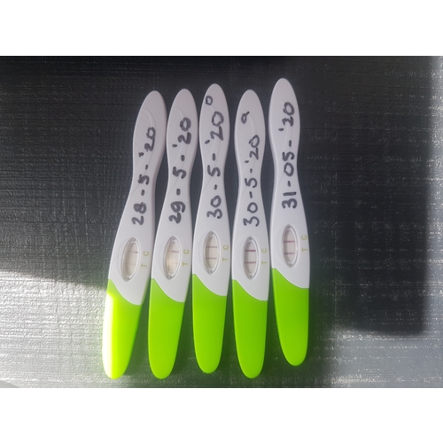 Ik had begrepen dat ochtendurine te geconcentreerd is, dus dat je hem beter een paar plasjes erna kunt doen. Maar zoals je ziet heb ik hem ook een keer 's avonds gedaan en dat werkte ook prima. Als er maar een beetje regelmaat in zit zolang je je piek nog niet hebt.