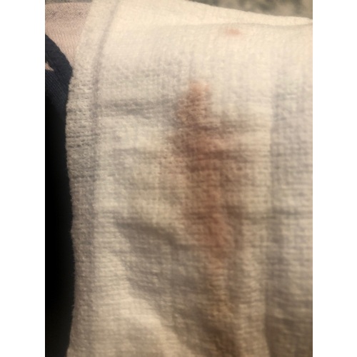 Deze kleur is het nu. Vanmiddag was het tijdens het afvegen helder rood dat is nu wat rozig/bruinig geworden (denk dat het door de utrogestan komt)