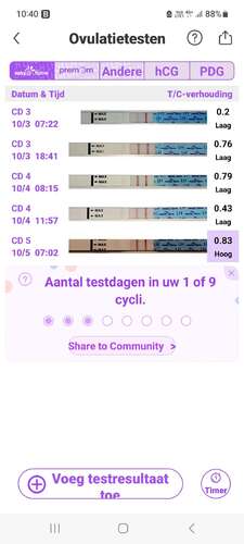 Dat is een goeie, bedankt voor de tip! Het is inderdaad even puzzelen wat het meest betrouwbaar werkt via de app. Voor mijn gevoel heb ik mijn eisprong ergens vorige week gehad. Ik had vanaf dinsdag gevoelige borsten (nog steeds een beetje, maar is vanaf vrijdag wel minder). Ook omdat de test vandaag veel lichter is, denk ik dat ik mijn ovulatie gehad heb. Maar better safe than sorry, dus ik test nog even door ;)