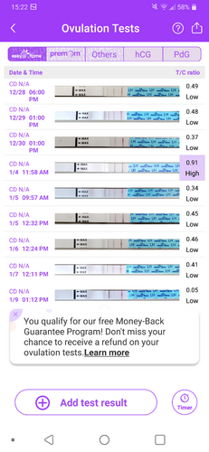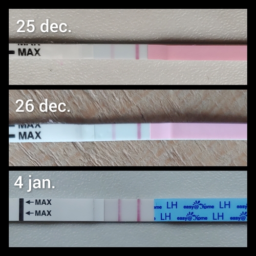 Wie wil meekijken? Ik heb begin november en halverwege december beide keren een miskraam gehad. Na mijn miskraam in november had ik 17 dagen na het eerste bloedverlies een duidelijke piek. Nu is het anders: het eerste bloedverlies is nu 29 dagen geleden. Vanaf 20 dec. begonnen met ovulatietesten, maar bleven licht (zoals bij 25 dec.). 26 dec. wel een donkerder streepje. Helaas waren toen de testen op. 28 dec. begonnen met Easy@home en de app geeft op 4 jan. 0.91 aan. De dagen daarna blijft ie hangen rond 0.4 - 0.45. Pas vanaf vandaag echt weer een licht streepje. Bij de vorige ronde had ik na de piek 2 dagen later al een heel licht streepje en nu pas 5 dagen later. Kan ik ervan uit gaan dat 4 januari mijn piek was? Ook al is die ook niet overtuigend positief. Ik vind de app overigens ook niet heel betrouwbaar: als ik van dezelfde stick achter elkaar een foto maak, kan die hele verschillende waarden aangeven. Ook het het verschil tussen handmatig een foto maken of automatisch scannen kan erg groot zijn
