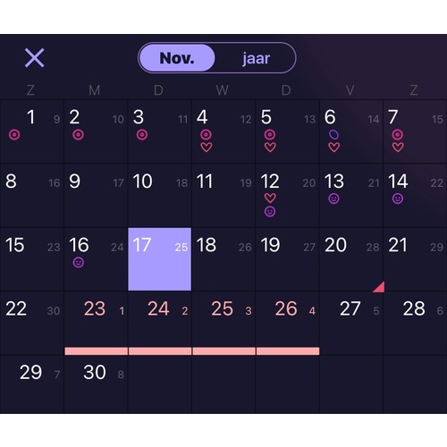 Ook als je cyclus normaal 30 dagen is. Na mijn miskraam wisselde dat een beetje. En dus staat er in mijn app dat ik eigenlijk pas 23 nov ongesteld had moeten worden. Mijn vorige menstruatie begon 24 oktober. Heel licht wel die bloedingen dus ik snap er niets meer van.