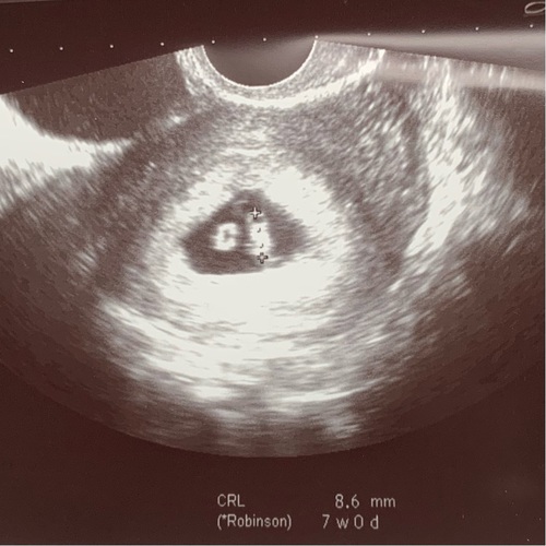 Hier onze echo met 7 weken. Links is de dooierzak, rechts de baby. Wij zagen echt een soort flikkerend lampje, dat was het hartje 馃グ Bij mij was het ook een inwendige echo, maar dat voel je amper. Stuk minder koud dan het echoapparaat op je buik in ieder geval 馃槄 hahaha