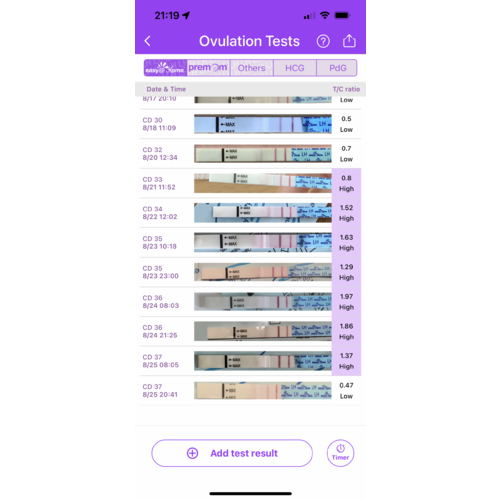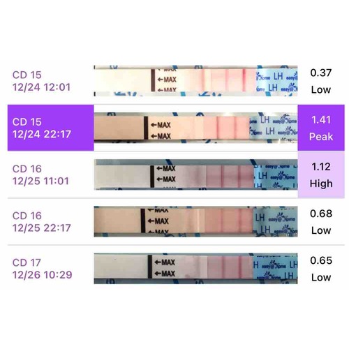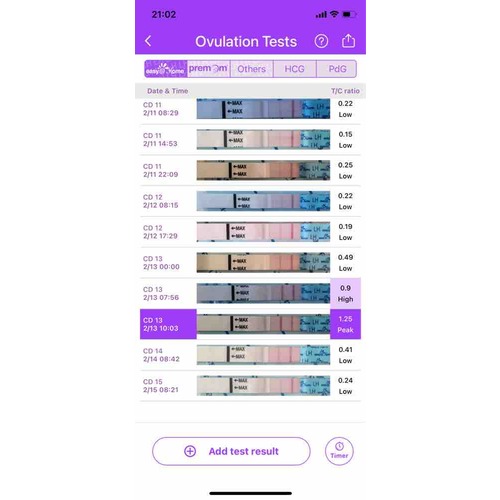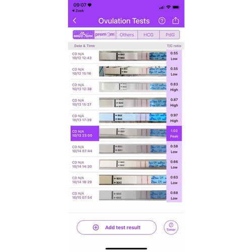 Hoi, ik heb altijd goede ervaringen met easy@home testen. Ik test rond mijn eisprong twee keer per dag en soms zelfs 3 keer. Ik heb een hele korte lh oploop. Niet met je ochtend urine testen en verder maakt het niet zo veel uit hoe laat je test. Dit is een voorbeeld van deze maand. Succes 🍀 🤞