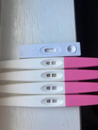 Elke dag een test gedaan, dus 4 dagen vanaf boven gezien en dan de onderste is vandaag. Ik heb het vanmorgen met ochtend urine gedaan maar als ik nu terug denk waren de testen die in mijn ogen donkerder waren andere tijden op de dag. Bedankt voor je advies!🩷