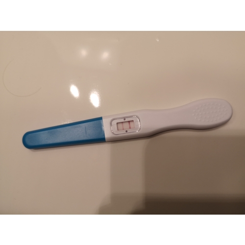 Vandaag is officieel mijn NOD. Dit weet ik ivm medisch traject in het ziekenhuis. Op de foto de etos zwangerschapstest. Deze uitslag pas al binnen 3 minuten af te lezen.