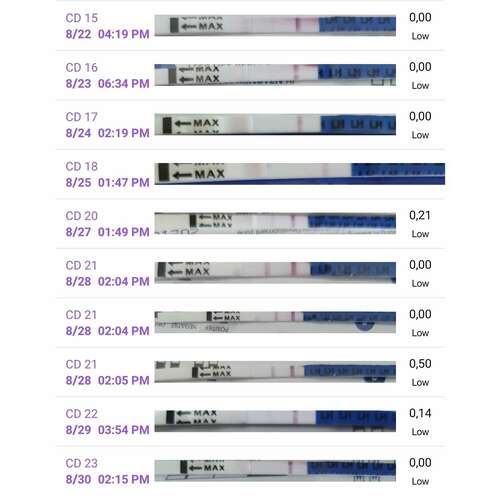 Het lijkt of van die 2 testen op de 21e de foto niet goed is gemaakt. Je ziet overduidelijk dat die strepen dikker zijn dan bij cd20 bijvoorbeeld.