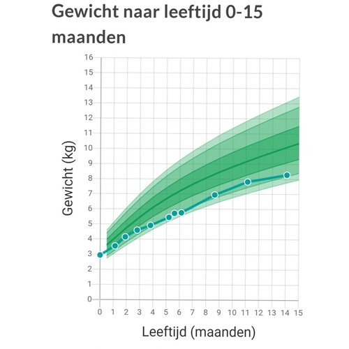 Ik heb even een foto toegevoegd van de lijn van mijn dochter tot ze 15 mnd was. (Gewicht naar leeftijd). Je ziet dat ze ruim onder het gemiddelde zit, maar dat ze wel netjes in haar eigen lijn blijft. Met 8,4 kilo zou ik me dus ook zeker geen zorgen maken, tenzij ze eerder bijv een lijn hoger zat.