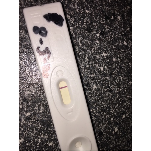 Ik zie op de test geen tweede streepje. Toen mijn vriend suggereerde dat ik misschien zwanger was (hoewel ik de pil nam), heb ik ook deze test van het Kruidvat gedaan... wel 3 keer! Ik kon namelijk niet geloven dat het resultaat van de eerste test positief was. Bij mij was er toen 3 keer heel duidelijk een tweede streepje te zien.