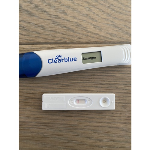 De clearblue test die ik net had gedaan en de Kruidvat gaven binnen de afleestijd zwanger aan!