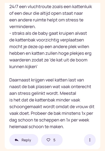 Ligt er aan wat jullie wensen zijn straks met de baby en de katten. Ik ben hierin vrij makkelijk denk ik. Katten waren er eerder als onze kinderen dus ik wilde ze niet vanalles ontnemen. Ze mogen dus gerust in de box of bedje. Maak het gewoon vaak schoon met de kledingroller en was het goed. Merk dat ik sinds de komst van de kinderen wel bewuster moet denken om ze aandacht te geven, omdat je overdag zo druk met je kinderen bent en we 's avonds ook vaak nog wat te doen hebben. Dus als ze dan aandacht vragen knuffel ik ze extra