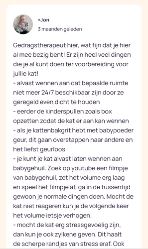 Aan onze kat niets gemerkt. Box stond al 3 maanden in de kamer, heeft hij 2x ingezeten maar zijn eigen mandje in de zon vindt hij toch fijner. Baby heeft hij 2x aan gesnuffeld. Babykamer glipt hij soms in maar gaat dan ook alleen in de vensterbank zitten, niet in het ledikant. Komt ook gewoon nog bij ons zitten, ook als we de baby op schoot hebben en ook als ze dan huilt. Hij reageert er niet echt op. Hij kan naar buiten wanneer hij wil. Boven mag hij niet (ook al voor de baby er was) maar doet hij natuurlijk wel als de deur open staat. Hij ligt graag in de maxi cosi als hij de kans krijgt dus daar letten we wel op. Maar de baby vindt hij niet interessant en kennelijk ook niet storend...