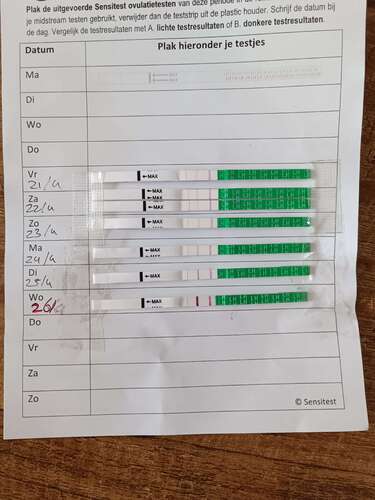 Ik had op 17 april in de avond een positieve test maar op 18 april in de ochtend was het pas echt een knaltest. De volgende ochtend 19 april nog een ovulatie test gedaan. Deze was niet meer positief. Ik heb met deze cyclus al eens een positieve test in handen gehad in januari maar dit eindigde helaas een week later in een miskraam.