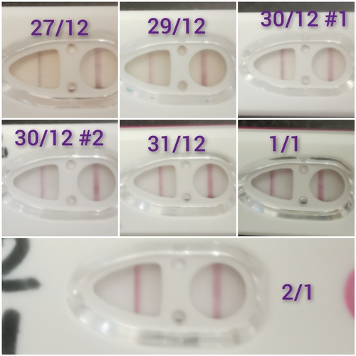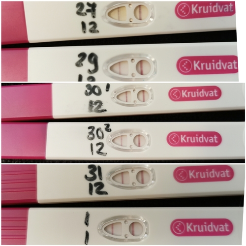 Je piek lijkt eerder de 31e te zijn. Want die van 1 Jan wordt al wat lichter dan die van de 31e. Het kan zijn dat deze testen erg gevoelig zijn waardoor er altijd een streep zichtbaar is, ik heb dit zelf namelijk gehad met een gevoelige test van Sensitest. Deze bleef ook maar twee strepen geven en uiteindelijk deed ik een test die minder gevoelig is en daar op zag je duidelijk de streep komen en verdwijnen.