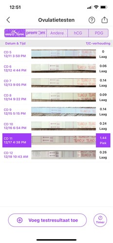 Maar los daarvan... maakt die ene dag in principe niet zo gek veel uit als je de LH-piek op deze manier toch vangt denk ik. Wel voornaam dat je luteale fase niet te lang duurt (geloof langer dan 14-16 dagen).
