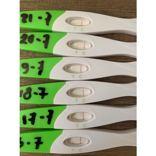 En de Clearblue testen! Ik weet dat je geen streepjes mag aflezen bij deze digitale test, maar je ziet duidelijk niet echt een oploop! De onderste is van vandaag! 🤔