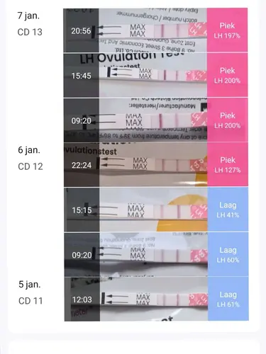 LH-piek kan zeker 48 uur aanhouden dus ik zie hierin niets geks. Alleen de eerste positieve ovulatietest vertelt je dat je binnen twee dagen je eisprong mag verwachten. Je had oo CD13 niet meer hoeven testen.
